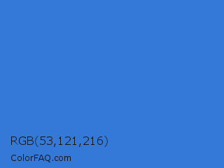 RGB 53,121,216 Color is a normal blue color and the nearest color is Han Blue #446ccf. Hex code #3579d8 and RGB value is rgb(53,121,216). In RGB color space, this color is composed of 21% red, 47% green, 85% blue, In CMYK color space, this color is composed of 75% cyan, 44% magenta, 0% yellow , 15% black , In HSL color space, this color has a hue angle of 215° , 68% saturation and 53% lightness.