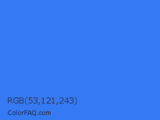 RGB 53,121,243 Color is a normal blue color and the nearest color is Ultramarine Blue #4166f5. Hex code #3579f3 and RGB value is rgb(53,121,243). In RGB color space, this color is composed of 21% red, 47% green, 95% blue, In CMYK color space, this color is composed of 78% cyan, 50% magenta, 0% yellow , 5% black , In HSL color space, this color has a hue angle of 219° , 89% saturation and 58% lightness.