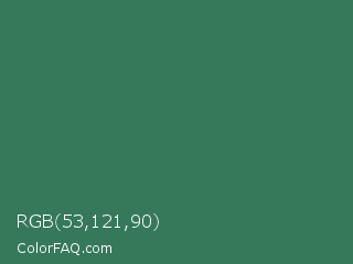RGB 53,121,90 Color is a normal green color and the nearest color is Amazon #3b7a57. Hex code #35795a and RGB value is rgb(53,121,90). In RGB color space, this color is composed of 21% red, 47% green, 35% blue, In CMYK color space, this color is composed of 56% cyan, 0% magenta, 26% yellow , 53% black , In HSL color space, this color has a hue angle of 153° , 39% saturation and 34% lightness.