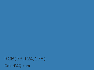 RGB 53,124,178 Color is a normal blue color and the nearest color is Steel Blue #4682b4. Hex code #357cb2 and RGB value is rgb(53,124,178). In RGB color space, this color is composed of 21% red, 49% green, 70% blue, In CMYK color space, this color is composed of 70% cyan, 30% magenta, 0% yellow , 30% black , In HSL color space, this color has a hue angle of 206° , 54% saturation and 45% lightness.