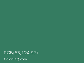 RGB 53,124,97 Color is a normal green color and the nearest color is Amazon #3b7a57. Hex code #357c61 and RGB value is rgb(53,124,97). In RGB color space, this color is composed of 21% red, 49% green, 38% blue, In CMYK color space, this color is composed of 57% cyan, 0% magenta, 22% yellow , 51% black , In HSL color space, this color has a hue angle of 157° , 40% saturation and 35% lightness.