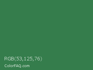 RGB 53,125,76 Color is a normal green color and the nearest color is Goblin #3d7d52. Hex code #357d4c and RGB value is rgb(53,125,76). In RGB color space, this color is composed of 21% red, 49% green, 30% blue, In CMYK color space, this color is composed of 58% cyan, 0% magenta, 39% yellow , 51% black , In HSL color space, this color has a hue angle of 139° , 40% saturation and 35% lightness.