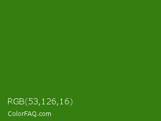 RGB 53,126,16 Color is a dark green color and the nearest color is Bilbao #327c14. Hex code #357e10 and RGB value is rgb(53,126,16). In RGB color space, this color is composed of 21% red, 49% green, 6% blue, In CMYK color space, this color is composed of 58% cyan, 0% magenta, 87% yellow , 51% black , In HSL color space, this color has a hue angle of 100° , 77% saturation and 28% lightness.