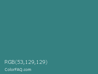 RGB 53,129,129 Color is a normal cyan color and the nearest color is Paradiso #317d82. Hex code #358181 and RGB value is rgb(53,129,129). In RGB color space, this color is composed of 21% red, 51% green, 51% blue, In CMYK color space, this color is composed of 59% cyan, 0% magenta, 0% yellow , 49% black , In HSL color space, this color has a hue angle of 180° , 42% saturation and 36% lightness.