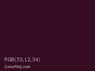 RGB 53,12,34 Color is a very dark rose color and the nearest color is Melanzane #300529. Hex code #350c22 and RGB value is rgb(53,12,34). In RGB color space, this color is composed of 21% red, 5% green, 13% blue, In CMYK color space, this color is composed of 0% cyan, 77% magenta, 36% yellow , 79% black , In HSL color space, this color has a hue angle of 328° , 63% saturation and 13% lightness.