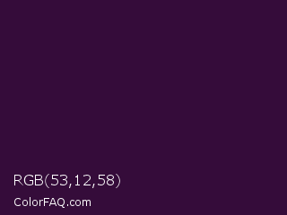 RGB 53,12,58 Color is a very dark magenta color and the nearest color is Valentino #350e42. Hex code #350c3a and RGB value is rgb(53,12,58). In RGB color space, this color is composed of 21% red, 5% green, 23% blue, In CMYK color space, this color is composed of 9% cyan, 79% magenta, 0% yellow , 77% black , In HSL color space, this color has a hue angle of 293° , 66% saturation and 14% lightness.