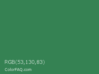 RGB 53,130,83 Color is a normal green color and the nearest color is Goblin #3d7d52. Hex code #358253 and RGB value is rgb(53,130,83). In RGB color space, this color is composed of 21% red, 51% green, 33% blue, In CMYK color space, this color is composed of 59% cyan, 0% magenta, 36% yellow , 49% black , In HSL color space, this color has a hue angle of 143° , 42% saturation and 36% lightness.