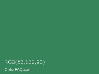 RGB 53,132,90 Color is a normal green color and the nearest color is Sea Green #2e8b57. Hex code #35845a and RGB value is rgb(53,132,90). In RGB color space, this color is composed of 21% red, 52% green, 35% blue, In CMYK color space, this color is composed of 60% cyan, 0% magenta, 32% yellow , 48% black , In HSL color space, this color has a hue angle of 148° , 43% saturation and 36% lightness.