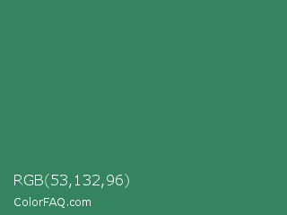 RGB 53,132,96 Color is a normal green color and the nearest color is Sea Green #2e8b57. Hex code #358460 and RGB value is rgb(53,132,96). In RGB color space, this color is composed of 21% red, 52% green, 38% blue, In CMYK color space, this color is composed of 60% cyan, 0% magenta, 27% yellow , 48% black , In HSL color space, this color has a hue angle of 153° , 43% saturation and 36% lightness.