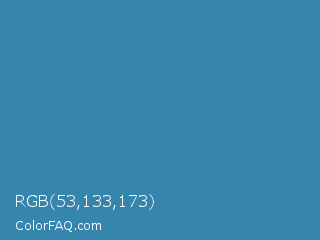 RGB 53,133,173 Color is a normal blue color and the nearest color is Boston Blue #3b91b4. Hex code #3585ad and RGB value is rgb(53,133,173). In RGB color space, this color is composed of 21% red, 52% green, 68% blue, In CMYK color space, this color is composed of 69% cyan, 23% magenta, 0% yellow , 32% black , In HSL color space, this color has a hue angle of 200° , 53% saturation and 44% lightness.