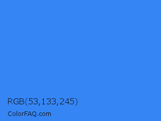RGB 53,133,245 Color is a normal blue color and the nearest color is Bleu De France #318ce7. Hex code #3585f5 and RGB value is rgb(53,133,245). In RGB color space, this color is composed of 21% red, 52% green, 96% blue, In CMYK color space, this color is composed of 78% cyan, 46% magenta, 0% yellow , 4% black , In HSL color space, this color has a hue angle of 215° , 91% saturation and 58% lightness.