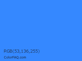 RGB 53,136,255 Color is a normal blue color and the nearest color is Brilliant Azure #3399ff. Hex code #3588ff and RGB value is rgb(53,136,255). In RGB color space, this color is composed of 21% red, 53% green, 100% blue, In CMYK color space, this color is composed of 79% cyan, 47% magenta, 0% yellow , 0% black , In HSL color space, this color has a hue angle of 215° , 100% saturation and 60% lightness.