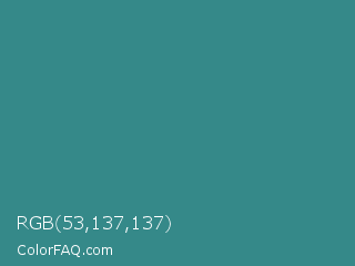 RGB 53,137,137 Color is a normal cyan color and the nearest color is Lochinvar #2c8c84. Hex code #358989 and RGB value is rgb(53,137,137). In RGB color space, this color is composed of 21% red, 54% green, 54% blue, In CMYK color space, this color is composed of 61% cyan, 0% magenta, 0% yellow , 46% black , In HSL color space, this color has a hue angle of 180° , 44% saturation and 37% lightness.