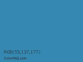 RGB 53,137,177 Color is a normal blue color and the nearest color is Boston Blue #3b91b4. Hex code #3589b1 and RGB value is rgb(53,137,177). In RGB color space, this color is composed of 21% red, 54% green, 69% blue, In CMYK color space, this color is composed of 70% cyan, 23% magenta, 0% yellow , 31% black , In HSL color space, this color has a hue angle of 199° , 54% saturation and 45% lightness.