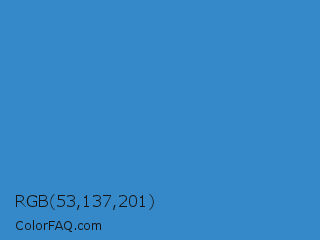 RGB 53,137,201 Color is a normal blue color and the nearest color is Cyan Blue Azure #4682bf. Hex code #3589c9 and RGB value is rgb(53,137,201). In RGB color space, this color is composed of 21% red, 54% green, 79% blue, In CMYK color space, this color is composed of 74% cyan, 32% magenta, 0% yellow , 21% black , In HSL color space, this color has a hue angle of 206° , 58% saturation and 50% lightness.