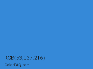 RGB 53,137,216 Color is a normal blue color and the nearest color is Tufts Blue #3e8ede. Hex code #3589d8 and RGB value is rgb(53,137,216). In RGB color space, this color is composed of 21% red, 54% green, 85% blue, In CMYK color space, this color is composed of 75% cyan, 37% magenta, 0% yellow , 15% black , In HSL color space, this color has a hue angle of 209° , 68% saturation and 53% lightness.