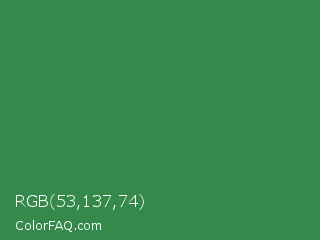 RGB 53,137,74 Color is a normal green color and the nearest color is Sea Green #2e8b57. Hex code #35894a and RGB value is rgb(53,137,74). In RGB color space, this color is composed of 21% red, 54% green, 29% blue, In CMYK color space, this color is composed of 61% cyan, 0% magenta, 46% yellow , 46% black , In HSL color space, this color has a hue angle of 135° , 44% saturation and 37% lightness.