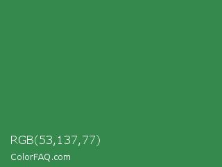 RGB 53,137,77 Color is a normal green color and the nearest color is Sea Green #2e8b57. Hex code #35894d and RGB value is rgb(53,137,77). In RGB color space, this color is composed of 21% red, 54% green, 30% blue, In CMYK color space, this color is composed of 61% cyan, 0% magenta, 44% yellow , 46% black , In HSL color space, this color has a hue angle of 137° , 44% saturation and 37% lightness.
