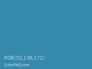 RGB 53,138,172 Color is a normal blue color and the nearest color is Boston Blue #3b91b4. Hex code #358aac and RGB value is rgb(53,138,172). In RGB color space, this color is composed of 21% red, 54% green, 67% blue, In CMYK color space, this color is composed of 69% cyan, 20% magenta, 0% yellow , 33% black , In HSL color space, this color has a hue angle of 197° , 53% saturation and 44% lightness.