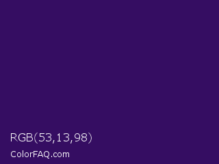 RGB 53,13,98 Color is a very dark violet color and the nearest color is Jagger #350e57. Hex code #350d62 and RGB value is rgb(53,13,98). In RGB color space, this color is composed of 21% red, 5% green, 38% blue, In CMYK color space, this color is composed of 46% cyan, 87% magenta, 0% yellow , 62% black , In HSL color space, this color has a hue angle of 268° , 77% saturation and 22% lightness.