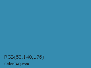 RGB 53,140,176 Color is a normal blue color and the nearest color is Boston Blue #3b91b4. Hex code #358cb0 and RGB value is rgb(53,140,176). In RGB color space, this color is composed of 21% red, 55% green, 69% blue, In CMYK color space, this color is composed of 70% cyan, 20% magenta, 0% yellow , 31% black , In HSL color space, this color has a hue angle of 198° , 54% saturation and 45% lightness.