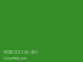 RGB 53,141,40 Color is a normal green color and the nearest color is La Palma #368716. Hex code #358d28 and RGB value is rgb(53,141,40). In RGB color space, this color is composed of 21% red, 55% green, 16% blue, In CMYK color space, this color is composed of 62% cyan, 0% magenta, 72% yellow , 45% black , In HSL color space, this color has a hue angle of 112° , 56% saturation and 35% lightness.