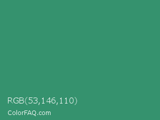 RGB 53,146,110 Color is a normal green color and the nearest color is Illuminating Emerald #319177. Hex code #35926e and RGB value is rgb(53,146,110). In RGB color space, this color is composed of 21% red, 57% green, 43% blue, In CMYK color space, this color is composed of 64% cyan, 0% magenta, 25% yellow , 43% black , In HSL color space, this color has a hue angle of 157° , 47% saturation and 39% lightness.