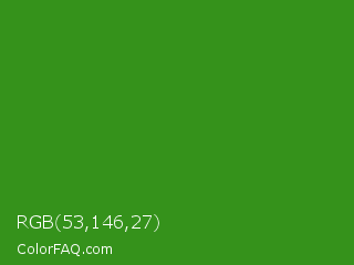 RGB 53,146,27 Color is a normal green color and the nearest color is La Palma #368716. Hex code #35921b and RGB value is rgb(53,146,27). In RGB color space, this color is composed of 21% red, 57% green, 11% blue, In CMYK color space, this color is composed of 64% cyan, 0% magenta, 82% yellow , 43% black , In HSL color space, this color has a hue angle of 107° , 69% saturation and 34% lightness.