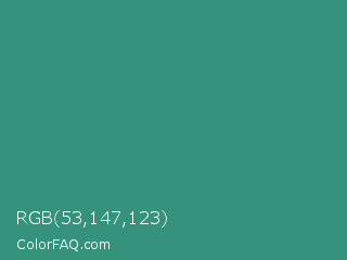 RGB 53,147,123 Color is a normal cyan color and the nearest color is Illuminating Emerald #319177. Hex code #35937b and RGB value is rgb(53,147,123). In RGB color space, this color is composed of 21% red, 58% green, 48% blue, In CMYK color space, this color is composed of 64% cyan, 0% magenta, 16% yellow , 42% black , In HSL color space, this color has a hue angle of 165° , 47% saturation and 39% lightness.