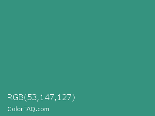 RGB 53,147,127 Color is a normal cyan color and the nearest color is Illuminating Emerald #319177. Hex code #35937f and RGB value is rgb(53,147,127). In RGB color space, this color is composed of 21% red, 58% green, 50% blue, In CMYK color space, this color is composed of 64% cyan, 0% magenta, 14% yellow , 42% black , In HSL color space, this color has a hue angle of 167° , 47% saturation and 39% lightness.