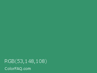 RGB 53,148,108 Color is a normal green color and the nearest color is Illuminating Emerald #319177. Hex code #35946c and RGB value is rgb(53,148,108). In RGB color space, this color is composed of 21% red, 58% green, 42% blue, In CMYK color space, this color is composed of 64% cyan, 0% magenta, 27% yellow , 42% black , In HSL color space, this color has a hue angle of 155° , 47% saturation and 39% lightness.