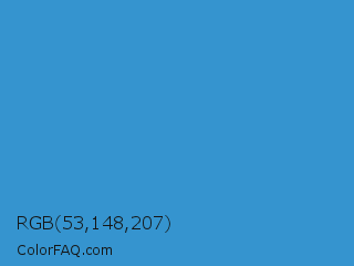 RGB 53,148,207 Color is a normal blue color and the nearest color is Curious Blue #2596d1. Hex code #3594cf and RGB value is rgb(53,148,207). In RGB color space, this color is composed of 21% red, 58% green, 81% blue, In CMYK color space, this color is composed of 74% cyan, 29% magenta, 0% yellow , 19% black , In HSL color space, this color has a hue angle of 203° , 62% saturation and 51% lightness.