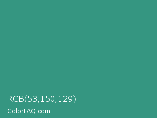 RGB 53,150,129 Color is a normal cyan color and the nearest color is Illuminating Emerald #319177. Hex code #359681 and RGB value is rgb(53,150,129). In RGB color space, this color is composed of 21% red, 59% green, 51% blue, In CMYK color space, this color is composed of 65% cyan, 0% magenta, 14% yellow , 41% black , In HSL color space, this color has a hue angle of 167° , 48% saturation and 40% lightness.