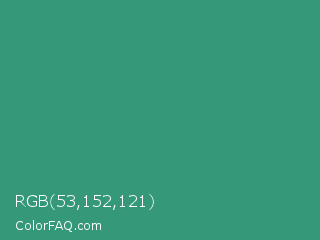 RGB 53,152,121 Color is a normal green color and the nearest color is Illuminating Emerald #319177. Hex code #359879 and RGB value is rgb(53,152,121). In RGB color space, this color is composed of 21% red, 60% green, 47% blue, In CMYK color space, this color is composed of 65% cyan, 0% magenta, 20% yellow , 40% black , In HSL color space, this color has a hue angle of 161° , 48% saturation and 40% lightness.