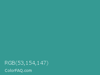 RGB 53,154,147 Color is a normal cyan color and the nearest color is Zomp #39a78e. Hex code #359a93 and RGB value is rgb(53,154,147). In RGB color space, this color is composed of 21% red, 60% green, 58% blue, In CMYK color space, this color is composed of 66% cyan, 0% magenta, 5% yellow , 40% black , In HSL color space, this color has a hue angle of 176° , 49% saturation and 41% lightness.