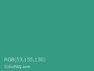 RGB 53,155,130 Color is a normal cyan color and the nearest color is Illuminating Emerald #319177. Hex code #359b82 and RGB value is rgb(53,155,130). In RGB color space, this color is composed of 21% red, 61% green, 51% blue, In CMYK color space, this color is composed of 66% cyan, 0% magenta, 16% yellow , 39% black , In HSL color space, this color has a hue angle of 165° , 49% saturation and 41% lightness.