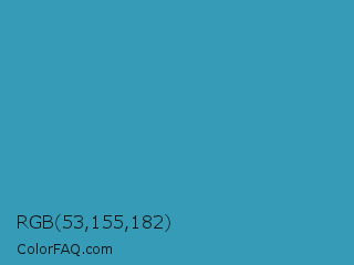 RGB 53,155,182 Color is a normal cyan color and the nearest color is Boston Blue #3b91b4. Hex code #359bb6 and RGB value is rgb(53,155,182). In RGB color space, this color is composed of 21% red, 61% green, 71% blue, In CMYK color space, this color is composed of 71% cyan, 15% magenta, 0% yellow , 29% black , In HSL color space, this color has a hue angle of 193° , 55% saturation and 46% lightness.