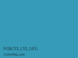 RGB 53,155,183 Color is a normal cyan color and the nearest color is Boston Blue #3b91b4. Hex code #359bb7 and RGB value is rgb(53,155,183). In RGB color space, this color is composed of 21% red, 61% green, 72% blue, In CMYK color space, this color is composed of 71% cyan, 15% magenta, 0% yellow , 28% black , In HSL color space, this color has a hue angle of 193° , 55% saturation and 46% lightness.