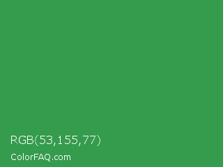 RGB 53,155,77 Color is a normal green color and the nearest color is Sea Green #2e8b57. Hex code #359b4d and RGB value is rgb(53,155,77). In RGB color space, this color is composed of 21% red, 61% green, 30% blue, In CMYK color space, this color is composed of 66% cyan, 0% magenta, 50% yellow , 39% black , In HSL color space, this color has a hue angle of 134° , 49% saturation and 41% lightness.