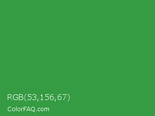 RGB 53,156,67 Color is a normal green color and the nearest color is May Green #4c9141. Hex code #359c43 and RGB value is rgb(53,156,67). In RGB color space, this color is composed of 21% red, 61% green, 26% blue, In CMYK color space, this color is composed of 66% cyan, 0% magenta, 57% yellow , 39% black , In HSL color space, this color has a hue angle of 128° , 49% saturation and 41% lightness.