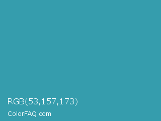 RGB 53,157,173 Color is a normal cyan color and the nearest color is Boston Blue #3b91b4. Hex code #359dad and RGB value is rgb(53,157,173). In RGB color space, this color is composed of 21% red, 62% green, 68% blue, In CMYK color space, this color is composed of 69% cyan, 9% magenta, 0% yellow , 32% black , In HSL color space, this color has a hue angle of 188° , 53% saturation and 44% lightness.