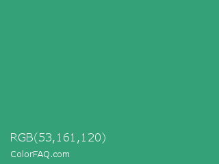 RGB 53,161,120 Color is a normal green color and the nearest color is Ocean Green #41aa78. Hex code #35a178 and RGB value is rgb(53,161,120). In RGB color space, this color is composed of 21% red, 63% green, 47% blue, In CMYK color space, this color is composed of 67% cyan, 0% magenta, 25% yellow , 37% black , In HSL color space, this color has a hue angle of 157° , 50% saturation and 42% lightness.