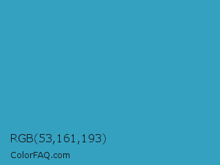 RGB 53,161,193 Color is a normal blue color and the nearest color is Pelorous #3eabbf. Hex code #35a1c1 and RGB value is rgb(53,161,193). In RGB color space, this color is composed of 21% red, 63% green, 76% blue, In CMYK color space, this color is composed of 73% cyan, 17% magenta, 0% yellow , 24% black , In HSL color space, this color has a hue angle of 194° , 57% saturation and 48% lightness.