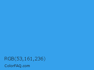 RGB 53,161,236 Color is a normal blue color and the nearest color is Button Blue #24a0ed. Hex code #35a1ec and RGB value is rgb(53,161,236). In RGB color space, this color is composed of 21% red, 63% green, 93% blue, In CMYK color space, this color is composed of 78% cyan, 32% magenta, 0% yellow , 7% black , In HSL color space, this color has a hue angle of 205° , 83% saturation and 57% lightness.
