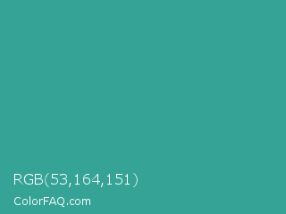 RGB 53,164,151 Color is a normal cyan color and the nearest color is Zomp #39a78e. Hex code #35a497 and RGB value is rgb(53,164,151). In RGB color space, this color is composed of 21% red, 64% green, 59% blue, In CMYK color space, this color is composed of 68% cyan, 0% magenta, 8% yellow , 36% black , In HSL color space, this color has a hue angle of 173° , 51% saturation and 43% lightness.