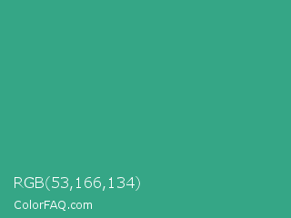 RGB 53,166,134 Color is a normal green color and the nearest color is Zomp #39a78e. Hex code #35a686 and RGB value is rgb(53,166,134). In RGB color space, this color is composed of 21% red, 65% green, 53% blue, In CMYK color space, this color is composed of 68% cyan, 0% magenta, 19% yellow , 35% black , In HSL color space, this color has a hue angle of 163° , 52% saturation and 43% lightness.