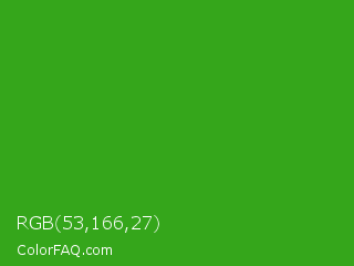 RGB 53,166,27 Color is a normal green color and the nearest color is Slimy Green #299617. Hex code #35a61b and RGB value is rgb(53,166,27). In RGB color space, this color is composed of 21% red, 65% green, 11% blue, In CMYK color space, this color is composed of 68% cyan, 0% magenta, 84% yellow , 35% black , In HSL color space, this color has a hue angle of 109° , 72% saturation and 38% lightness.