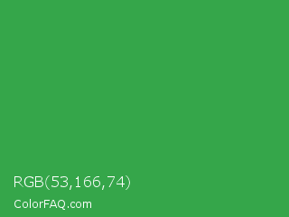 RGB 53,166,74 Color is a normal green color and the nearest color is Chateau Green #40a860. Hex code #35a64a and RGB value is rgb(53,166,74). In RGB color space, this color is composed of 21% red, 65% green, 29% blue, In CMYK color space, this color is composed of 68% cyan, 0% magenta, 55% yellow , 35% black , In HSL color space, this color has a hue angle of 131° , 52% saturation and 43% lightness.