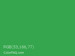 RGB 53,166,77 Color is a normal green color and the nearest color is Chateau Green #40a860. Hex code #35a64d and RGB value is rgb(53,166,77). In RGB color space, this color is composed of 21% red, 65% green, 30% blue, In CMYK color space, this color is composed of 68% cyan, 0% magenta, 54% yellow , 35% black , In HSL color space, this color has a hue angle of 133° , 52% saturation and 43% lightness.