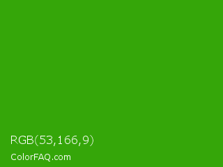 RGB 53,166,9 Color is a normal green color and the nearest color is Slimy Green #299617. Hex code #35a609 and RGB value is rgb(53,166,9). In RGB color space, this color is composed of 21% red, 65% green, 4% blue, In CMYK color space, this color is composed of 68% cyan, 0% magenta, 95% yellow , 35% black , In HSL color space, this color has a hue angle of 103° , 90% saturation and 34% lightness.